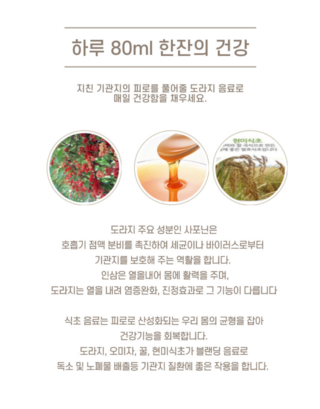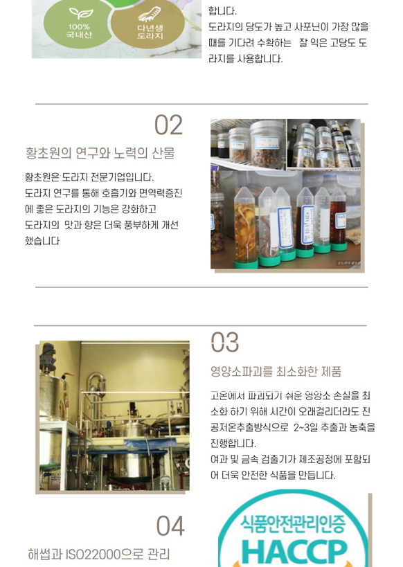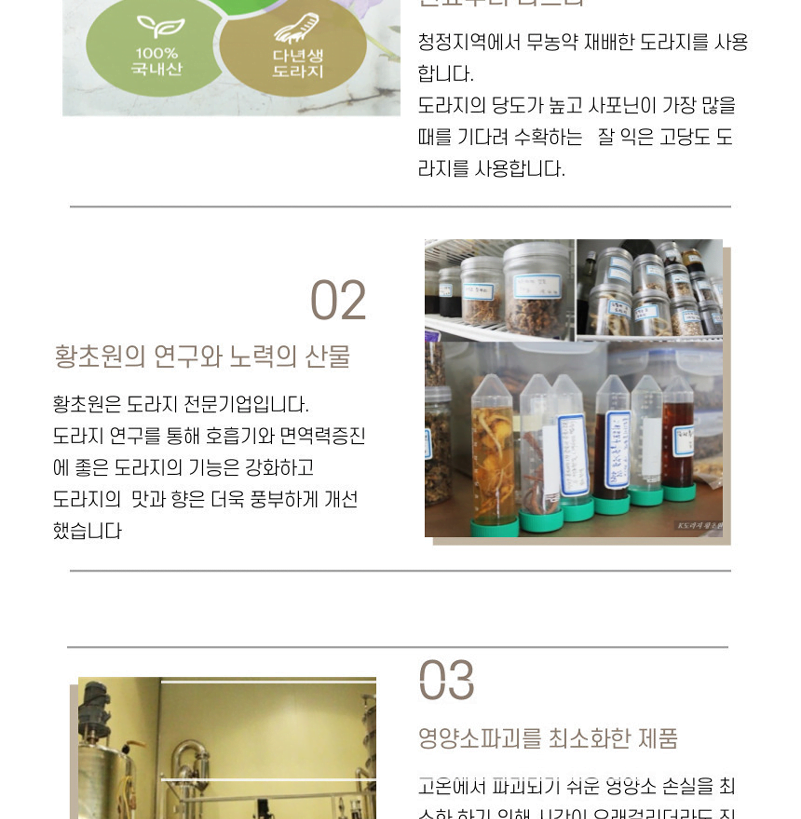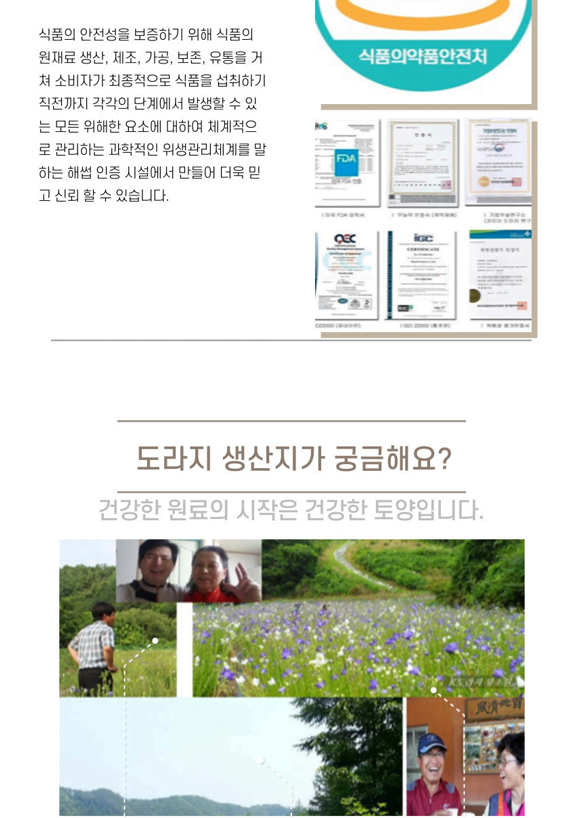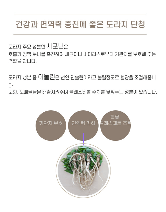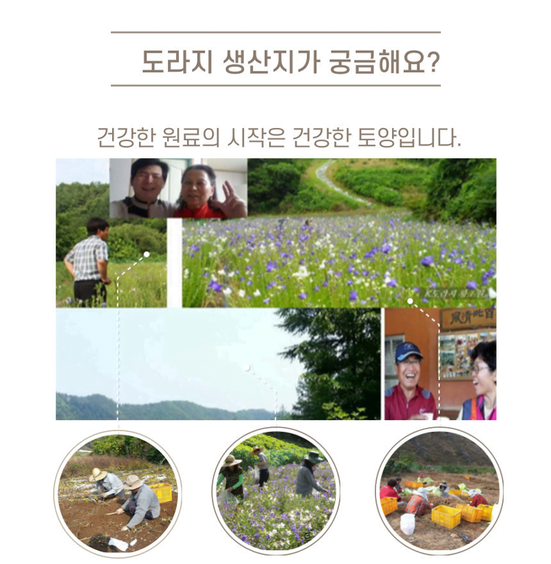 – 도라지 뿌리를 건조한 후 위생적으로 분쇄하며 도라지 세포벽을 허물어 흡수를 높인 분말입니다.