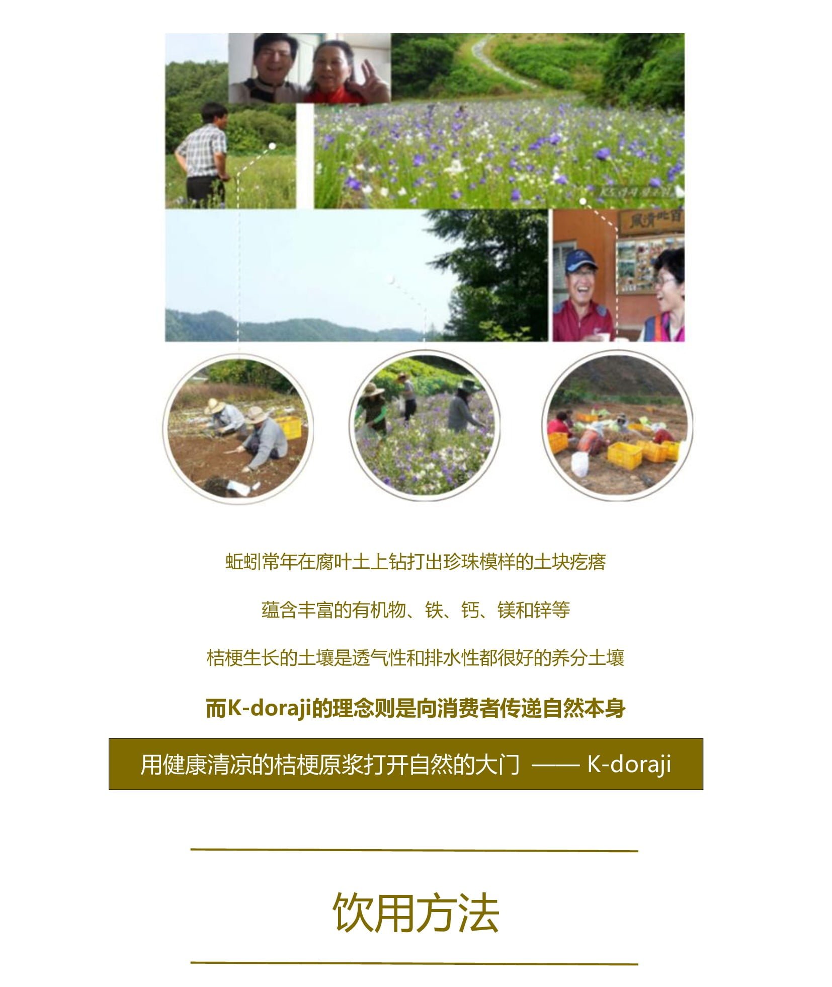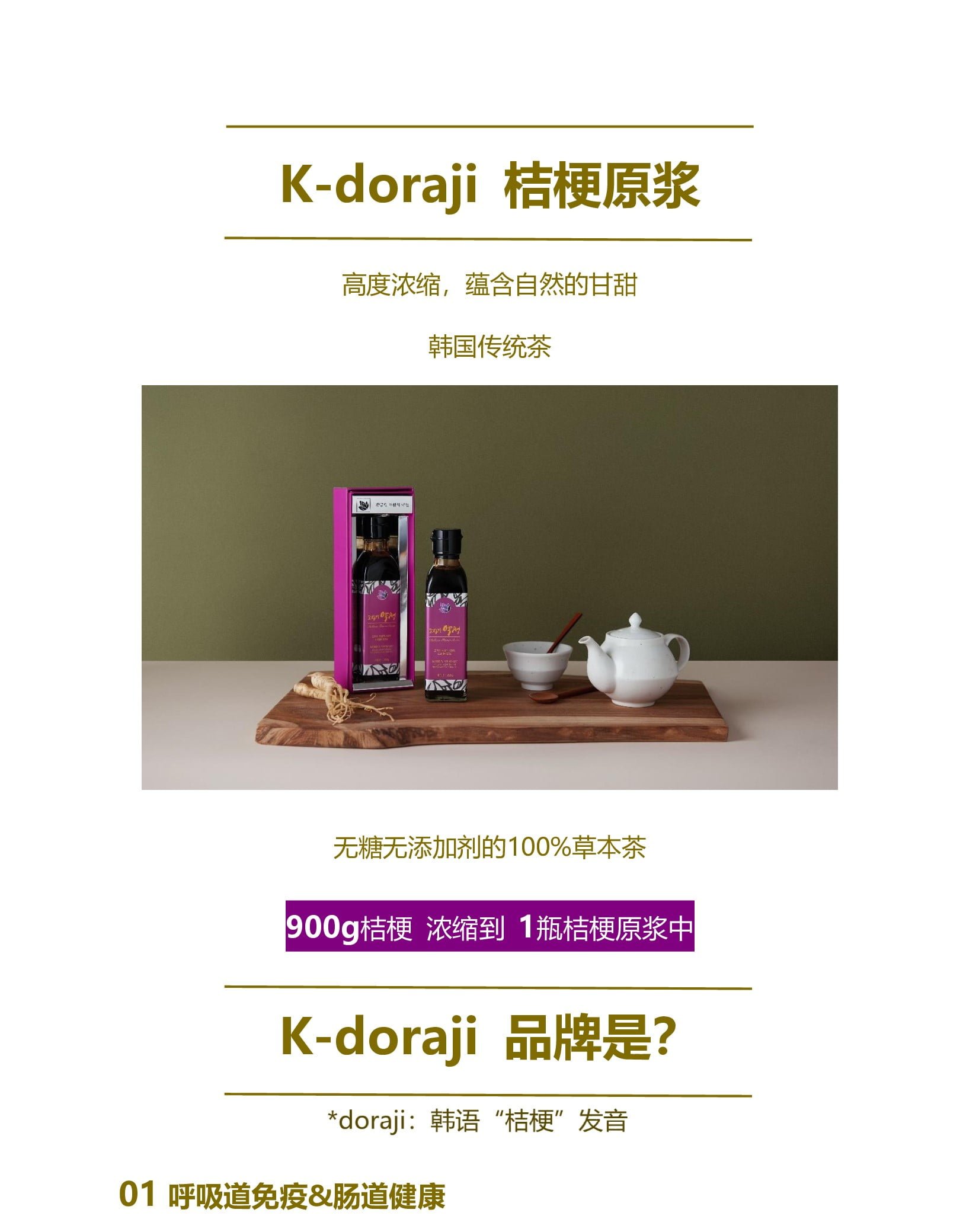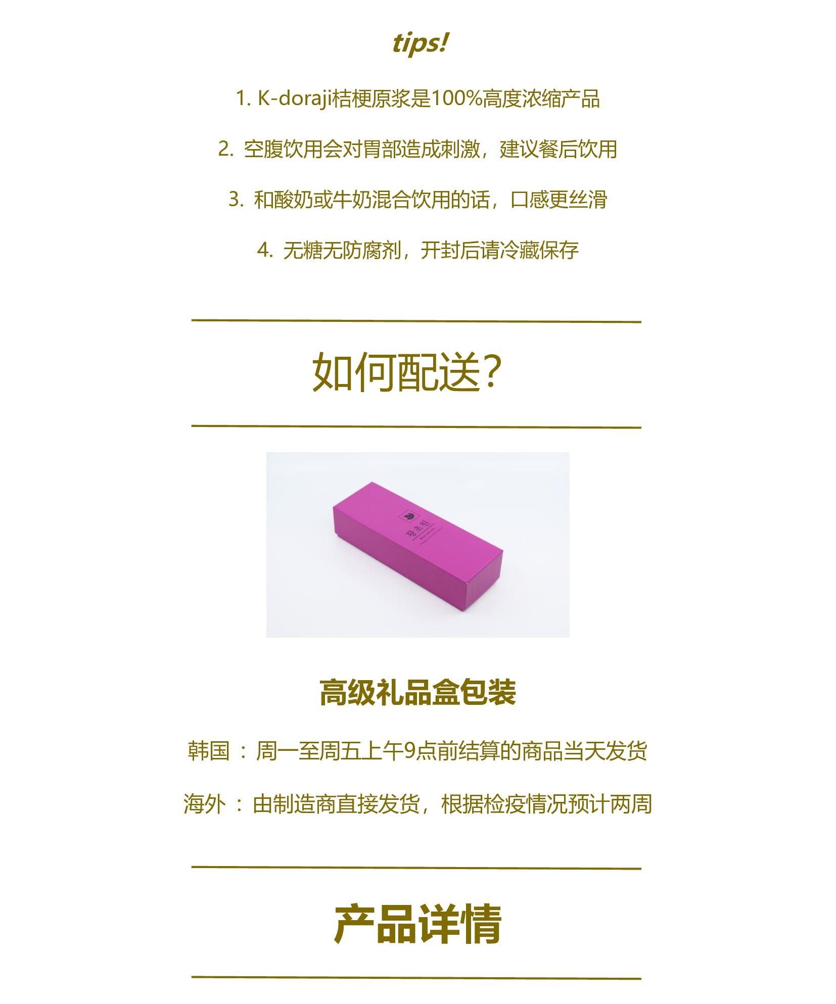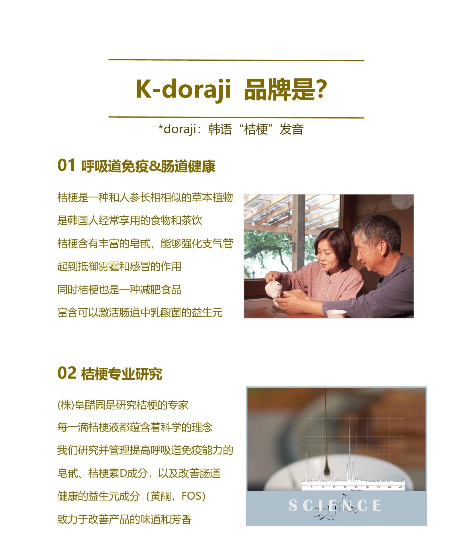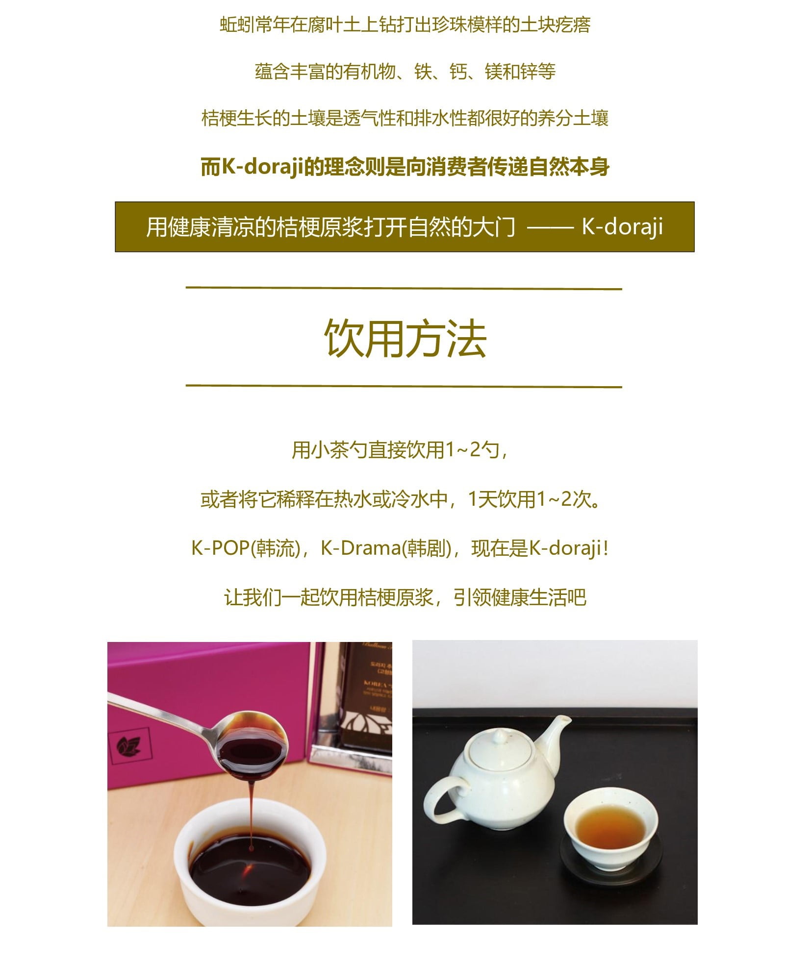 – 以K-doraji的独家原料和技术制成的100%高级桔梗浓缩液– 传递成熟桔梗的药性和甘甜